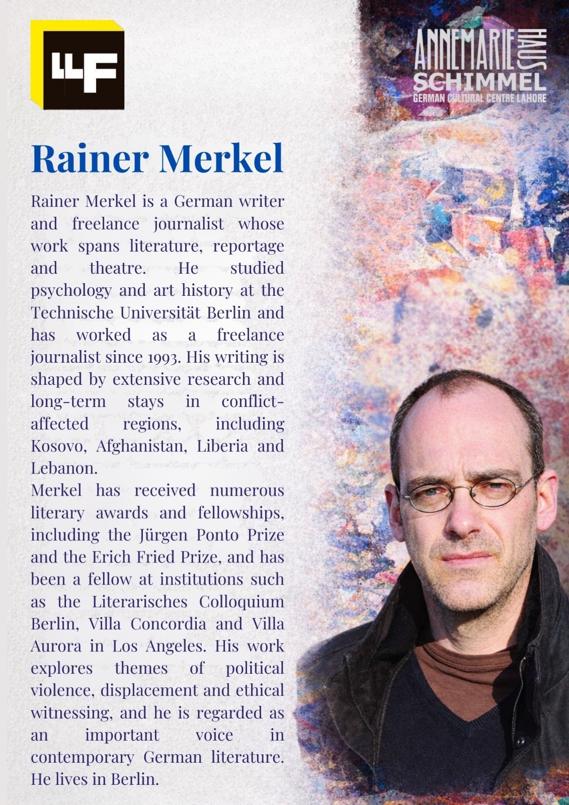 In addition to their appearances at the Lahore Literary Festival, both authors will conduct creative writing workshops at the Annemarie-Schimmel-Haus. They will also visit literature departments of selected universities during their stay, fostering literary exchange and dialogue with students, faculty members, and emerging writers.